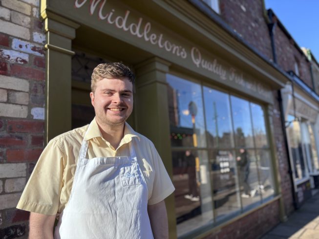 Front Street terrace has a tarmac road and a level flagstone path with dropped kerbs. TherLevel entrance into the hairdresser’s. e are cobbles at the edge of the town but these can be avoided by using the paths and dropped kerbs.
