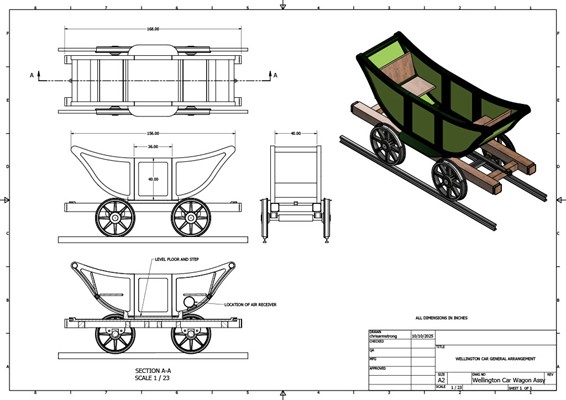 Blog readers may recall that in 2019 we built a two-foot gauge interpretation of the Wellington carriage (sketch and photo shown here), so it is nice to revisit this project and create a useful piece of rolling stock with an engaging story behind it that hopefully our visitors will greatly enjoy riding in.