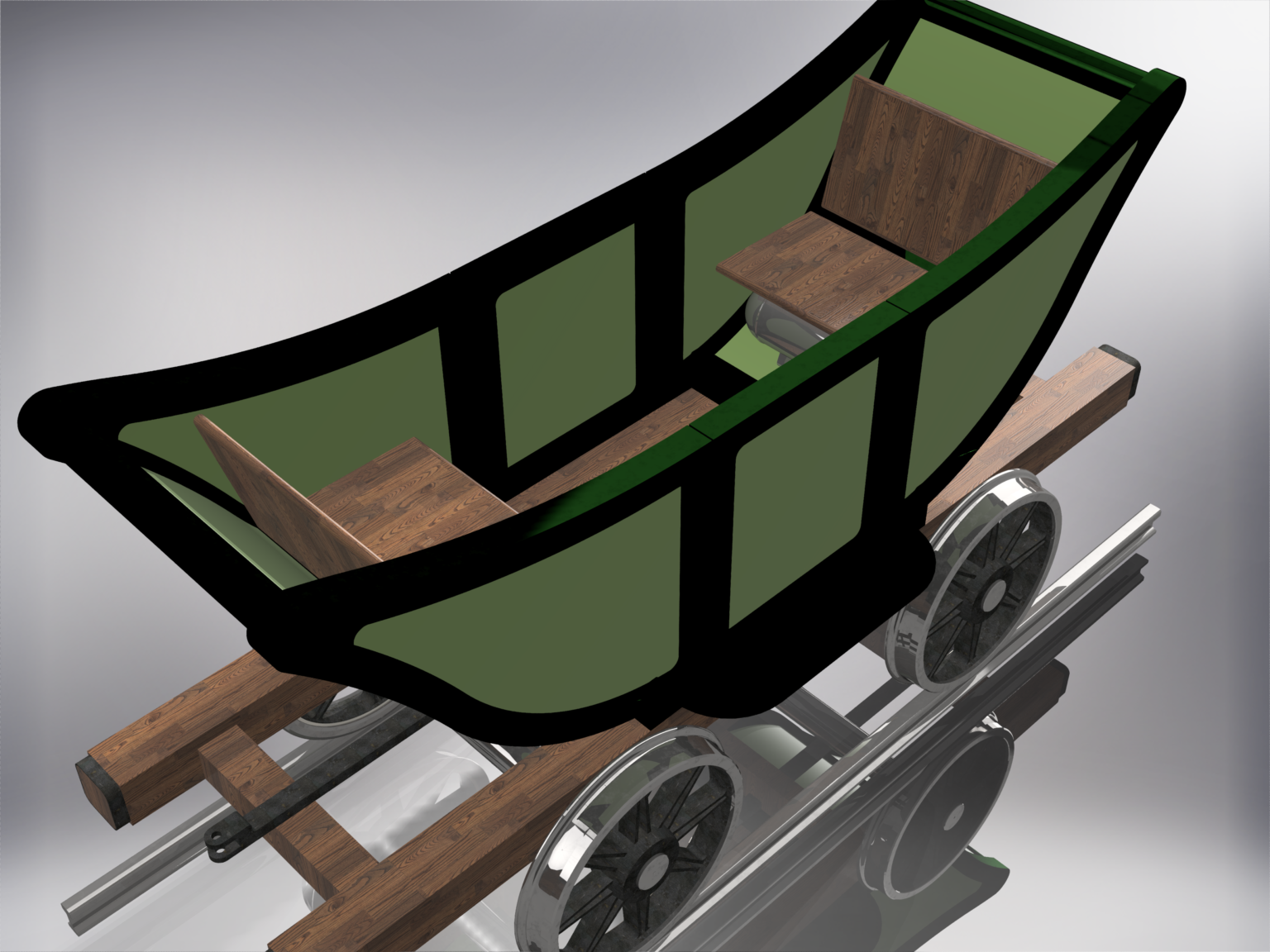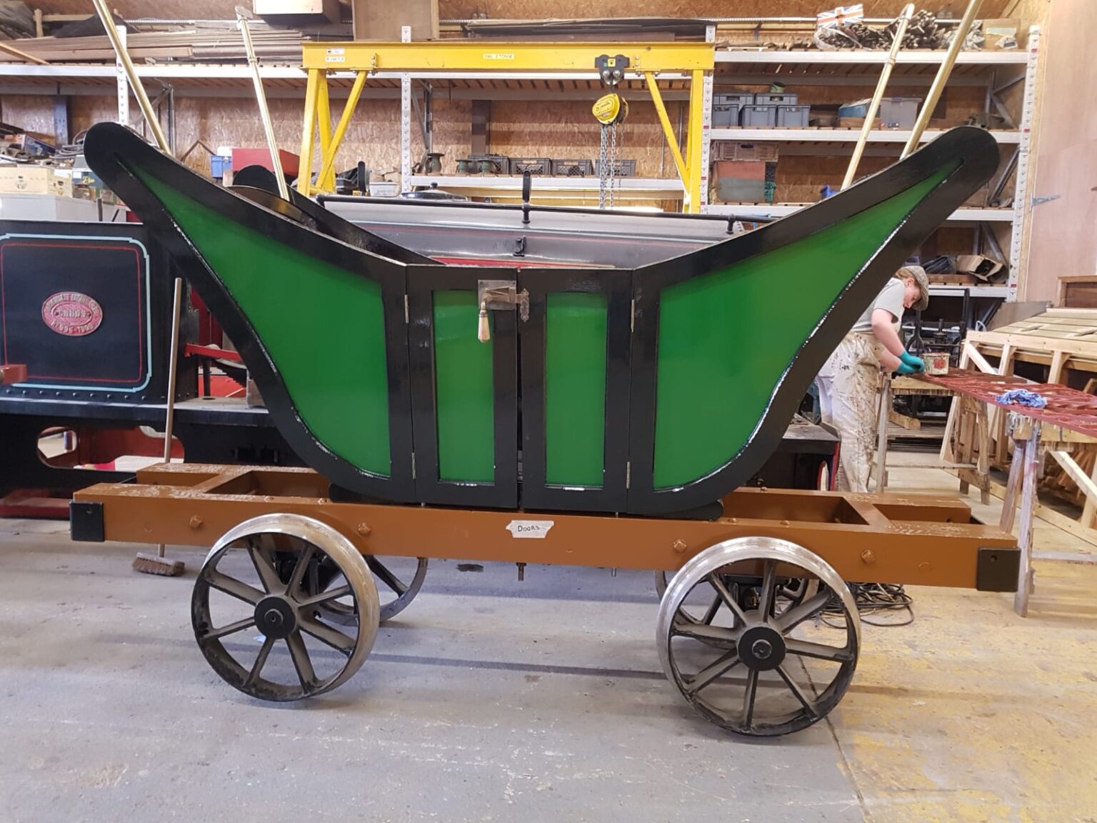 The design makes use of the well-proven chassis, coupling and brake system but with a new body better suited to the arduous conditions found at the Waggonway. The body design is still strongly anchored within the historical narrative of the north east’s early-railways. As this narrative is ‘light’ on passenger carrying vehicles in the period depicted, the design employed at Seaham, for their ‘Wellington Car’ in 1827 has been settled on as the basis for this new replica passenger coach.